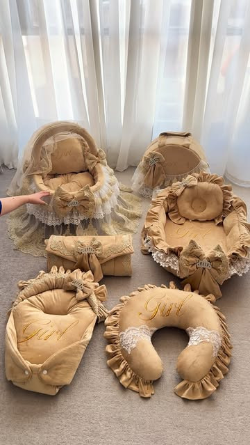 ست مخمل با حک اسم نوزاد شامل سبد حمل ۳ طبقه گیپور، ساک بیمارستانی، آغوشی، تشک گارددار و بالشت، فرمدهی تشک تعویض پوشک، بالشت شیردهی و نشیمن نوزاد.